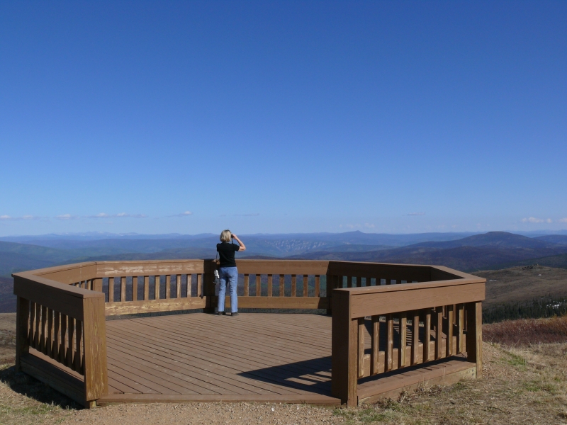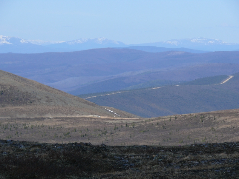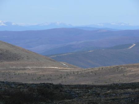 Hinter der Grenze beginnt der Top of the World Highway. Er macht seinem Namen alle Ehre. Hoch auf dem Grat des Gebirges schlängelt er sich entlang und gibt einen weiten Blick frei über die gestaffelten Hügelketten der Ogilvie Mountains.