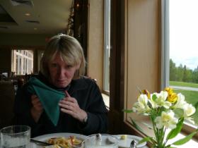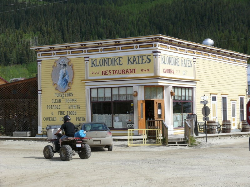 Nachdem wir im Dawson City General Store, dem tatsächlich einzigen Lebensmittelgeschäft hier, eingekauft haben und ich im Internet-Café einige E-Mails auf den Weg gebracht habe, beschließen wir, einmal nicht selber zu kochen, sondern in der "Stadt" zu essen. Zufällig (oder liegt es am guten Instinkt?) erwischen wir mit dem Aurora Inn das beste Restaurant in Dawson City, wie wir später im Reiseführer lesen. Das Essen ist tatsächlich sehr gut, der Kellner äußerst aufmerksam, und wir essen mit Besteck von Laguiole! Wer hätte das hier erwartet? Mit riesigen T-Bone-Steaks decken wir unseren Fleischbedarf für die nächste Woche - die Wohnmobilküche ist nämlich vegetarisch.