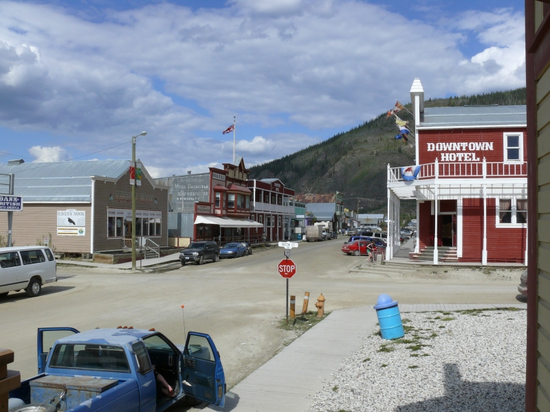 Heute ist Dawson City ein Ort, der noch schwankt zwischen Verfall und Touristenattraktion. Viele Gebäude stehen leer, andere sind liebevoll restauriert oder werden im alten Stil neu erbaut. Im wahrhaftig gleißenden Sonnenlicht (Es sind bestimmt mehr als 25° C, und wir haben unsere Sonnenbrillen im Auto gelassen!) schauen wir uns die Stadt an und versuchen, uns vorzustellen, wie es hier zu Zeiten des Goldrausches zuging. Zumindest an den Straßen hat sich nichts geändert. Es gibt keinen Asphalt, noch nicht einmal Schotter. Die Lehmwege sind staubig bei Trockenheit und matschig bei Regen. Im Moment fährt ein Sprengwagen herum, um den schlimmsten Staub zu binden.