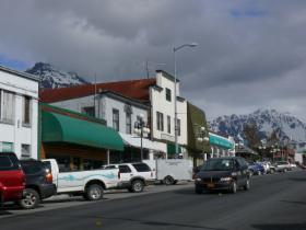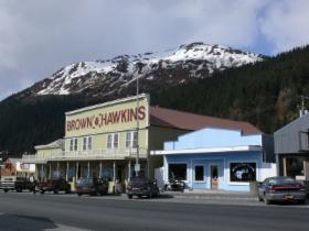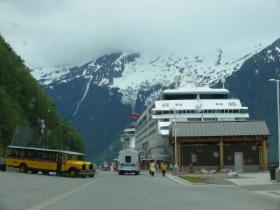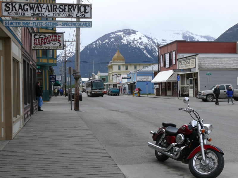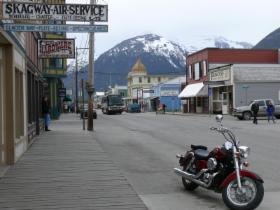 Nachdem wir am südlichen Ende des White Pass die amerikanische Zollstation passiert haben, sind es nur noch wenige Meilen bis Skagway, das gegen Ende des 19. Jahrhunderts die größte Stadt Alaskas war. Mehr als 20.000 Goldsucher landeten damals hier oder im benachbarten Dyea, um sich auf den Weg zum Yukon zu machen. Der alte Teil des heute kleinen Ortes steht als "Klondike Goldrush National Historic Park" unter Denkmalschutz. Links und rechts des Broadways reihen sich die Originalgebäude aus dieser Zeit. Heute bergen sie fast ausschließlich Souvenirläden, die gerade von den Passagieren der beiden Kreuzfahrtschiffe, die am Kai liegen, gestürmt werden. Im Sommer kann es vorkommen, dass gleichzeitig bis zu sechs große Kreuzfahrer hier festmachen. Skagway lebt mittlerweile einzig und allein vom Geschäft mit diesen Touristen. Für die hier Lebenden oder für andere Reisende ist das Angebot sehr eingeschränkt. Ich habe nur einen Lebensmittelladen gesehen, und es gibt auch nur eine Tankstelle.