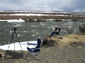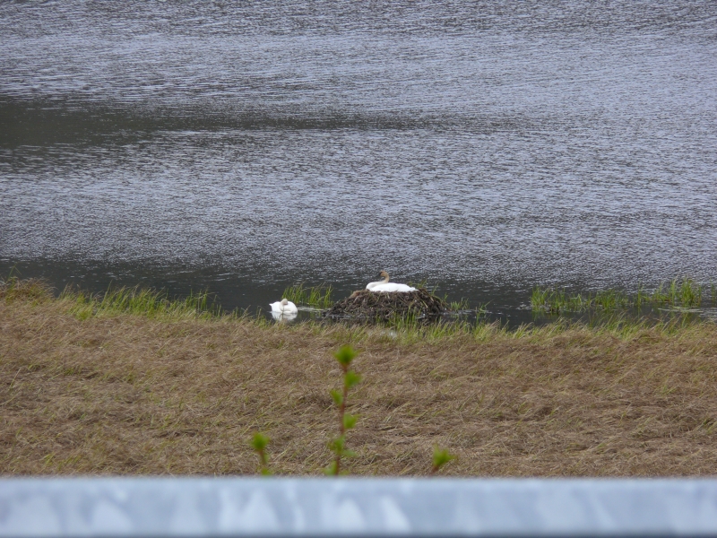 Unvermittelt ist es dann wieder sehr winterlich. Am Ufer des Dezadeash Lakes, an dem wir für einen Lunch anhalten, liegt noch viel Schnee. Davon lassen sich aber zwei Trompetenschwäne nicht abschrecken - sie unterhalten sich lauthals vor unserem Fenster.