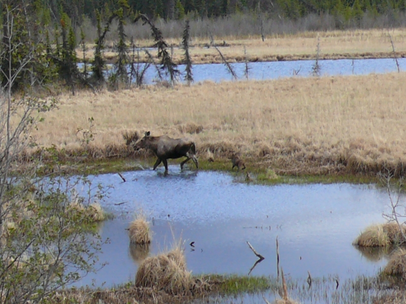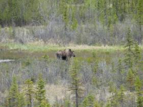 In Alcan passieren wir - auf dieser Reise zum letzten Mal - die Grenze zwischen dem Yukon in Kanada und Alaska in den USA. Im Grenzgebiet treffen wir wieder auf nistende Trompetenschwäne. Nachdem wir das Visitor's Center vom Tetlin National Wildlife Refuge besucht haben, geht es weiter nach Tok. Hier verlassen wir den Alaska Highway, um auf dem sogenannten Tok Cutoff nach Glennallen und dann auf den Glenn Highway zu fahren. Lange halten wir uns im Bereich der Mineral Lakes auf. Hier sehen wir mehrere Elche, sogar eine Kuh mit ihrem Kalb. Leider gibt es keine guten Haltepunkte in dieser Gegend, geschweige denn Übernachtungsplätze - schade!
