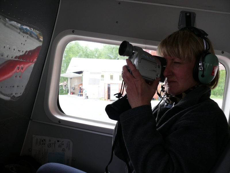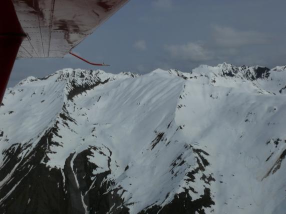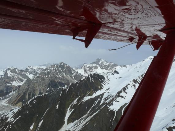 Nach einer kurzen Schleife über Talkeetna und das umgebende Buschland geht es in die Alaska Range. Sehr beeindruckend fliegen wir zwischen Gletschern und schneebedeckten Bergen hindurch. Manche sind zum Greifen nah. Leider hat sich das Wetter verschlechtert. Das heißt erstens, dass die Sicht nicht sehr gut ist und zweitens, dass wir nicht auf dem Gletscher landen können - schade! Aber der Flug bleibt trotzdem sehr eindrucksvoll, und die Zeit vergeht sprichwörtlich "wie im Flug". Ein tolles Erlebnis!