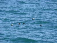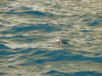 Auf der Rückfahrt durch die Chiswell Islands kommen wir an mehreren Vogelfelsen vorbei. So früh im Jahr brüten hier nur Kittywhakes (Dreizehenmöven) und Puffins (Papageien- taucher), aber die Luft ist erfüllt vom Gekreische der Vögel. Die Puffins treiben in großen Gruppen auf den Wellen. Sie leben den größten Teil des Jahres ausschließlich auf dem Wasser, allerdings weit draußen im Meer. An Land kommen sie nur zum Brüten. |