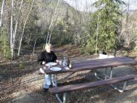 Ca. 15 Meilen hinter Chicken finden wir auch wieder einen netten staatlichen Campingplatz, den Walker Fork Campground, auf dem wir übernachten können. Es ist so warm, dass wir sogar draußen essen.