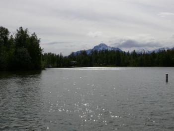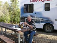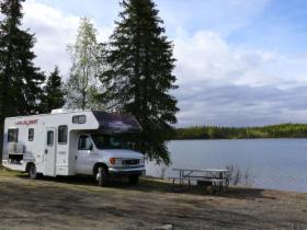 Es ist ziemlich spät geworden bei der Tierbeobachtung, und die Suche nach einem Platz für die Nacht wird ein wenig stressig. Trotzdem bleiben wir nicht auf dem Porcupine Campground, den wir als erstes anfahren. Er liegt sehr trist im Wald und macht einen verfallenen Eindruck. Mehr Glück haben wir auf einem privaten Platz am Grizzly Lake. Hier ist es ganz schön. Es gibt zwar keine abgetrennten Stellplätze, aber wir haben eine nette Umgebung und eine schöne Aussicht auf den See.