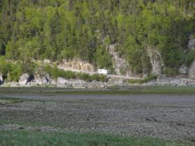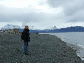 Nachdem wir uns am Hafen noch mit Fish 'n Chips gestärkt haben, fahren wir nach Dyea auf der anderen Seite des Taiya Inlets, des Meeresarms, an dem auch Skagway liegt. Hier wollen wir übernachten. Dyea war einmal genauso groß wie Skagway. Zu Hochzeiten lebten hier 2000 Menschen, heute sind nicht einmal mehr die Fundamente der Häuser zu erkennen. Die Natur hat das Terrain zurück erobert. Aber die Gegend ist schön und der Strand lädt zum Laufen ein. Leider ist es trotz Sonne empfindlich kalt, so dass wir es nicht lange draußen aushalten. Außerdem ist gerade Ebbe, und es gibt nicht viel Interessantes zu sehen.
