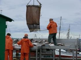 Nachdem wir uns bei Fish 'n Chips gestärkt haben (natürlich aus Heilbutt), machen wir einen Rundgang. Im Hafen sind gerade Fischerboote angekommen. Wir können beobachten, wie der Heilbutt ausgeladen und in Kühlbehälter verpackt wird.