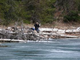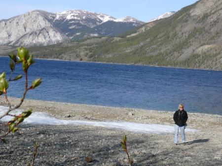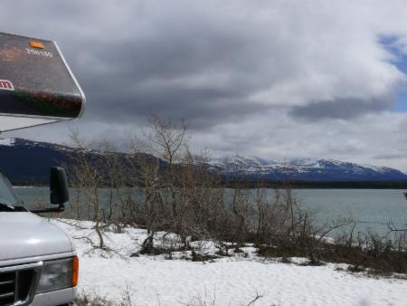Dann suchen wir uns kurz vor dem White Pass am Windy Arm, einem Ausläufer des Tagish Lake, einen Platz für die Nacht. Ulrich hat ein gutes Gefühl dafür entwickelt, wie geländegängig unser Auto ist, und so müssen uns auch enge Wege nicht schrecken. Leider versperrt ein Schneefeld die letzten Meter bis direkt an den See, aber der Platz ist trotzdem schön. Und um draußen am Wasser zu sitzen ist es sowieso zu kalt. Mit der richtigen Kleidung ist aber ein Spaziergang am See nicht zu verachten.