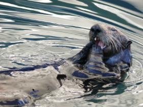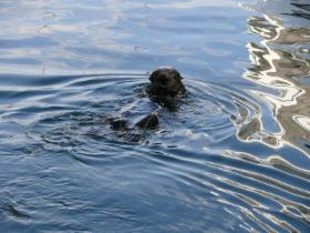 Zum krönenden Abschluss tummelt sich ein Seeotter im Hafenbecken; er ist eifrig dabei, eine Muschel zu knacken.