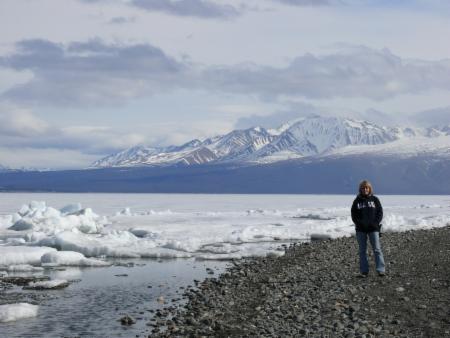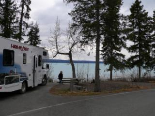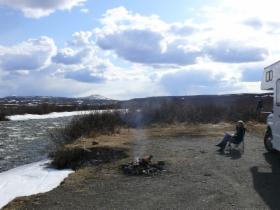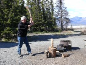 Ein großer Teil des Sees ist noch zugefroren, und am Ufer schieben sich die Eisschollen zusammen. Wir finden einen traumhaften Übernachtungsplatz auf einem staatlichen Campground. Die Wolken haben sich mittlerweile verzogen, und die Sonne scheint vom strahlend blauen Himmel. Aber es bleibt empfindlich kalt - eine gute Gelegenheit für ein wärmendes Lagerfeuer. Natürlich gibt es eine Feuerstelle, und auch Holz steht zur Verfügung. Es muss nur noch gehackt werden! Unsere "Nachbarn" (zwei Männer aus Süddeutschland, die wir schon auf der Fähre von Skagway nach Haines gesehen haben) leihen uns ihre Axt. Sie haben ein Wohnmobil von Fraserway, da gehört so etwas zur Ausstattung.