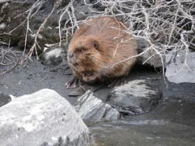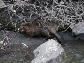 Nach dem Essen begeben wir uns auf den weiteren Weg auf dem Klondike-Highway Richtung Whitehorse. Es wird hier um diese Jahreszeit gar nicht richtig dunkel, und wir können noch lange fahren. Das erste Stück der Strecke führt entlang des Klondike River. Am Straßenrand sieht man die typischen raupenförmigen Abraumhalden der großen Schaufelbagger der Goldsucher. Am Gravel Lake beobachten wir Biber, die dabei sind, Bäumchen und Äste abzunagen.