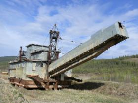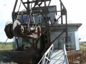Hier können wir eine alte Dredge anschauen, einen Schwimmbagger mit einer Goldwaschanlage. Mit solchen Geräten wurde der Schlamm aus den Flüssen hochgebaggert und dann das Gold aus ihm herausgewaschen.