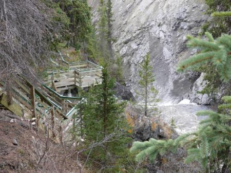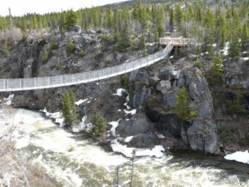 Von der Hängebrücke aus kann man den reißenden Wildbach bewundern. Auf Stelltafeln wird die Geschichte der Goldsucher erzählt, die in Skagway mit Schiffen ankamen und ihre Ausrüstung von dort über die Berge zum etwa 100 km entfernten Carcross transportieren mussten, um sie auf Boote auf dem Yukon verladen zu können. Die Reicheren der Goldsucher gingen dazu mit Packpferden über den berüchtigten White Pass Trail, der sich an den steilen Felswänden entlang des Skagway Rivers hinzog. Allein 1897 verendeten über 3000 Pferde auf dieser Strecke. Die ärmeren der Stampeder mussten ihre Ausrüstung selber schleppen. Sie gingen über den Chilkoot Pass, der nicht weniger unwegsam war.