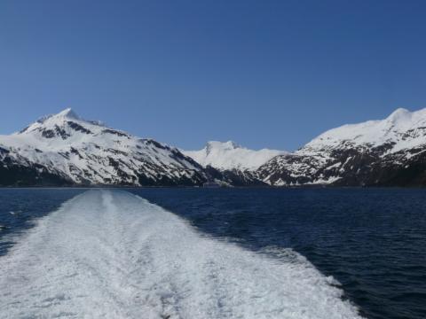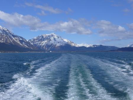 Um 12.45 Uhr legt unsere Fähre ab. Die Fahrt durch den Prince William Sound nach Valdez dauert knapp drei Stunden. Hier ist Ostern 1989 die Exxon Valdez, ein sogenannter Riesentanker, auf ein Riff gelaufen. In der Folge sind 40 Millionen Liter Rohöl ins Meer geflossen und haben ca. 2000 km Küstenlinie verseucht. Heute bemerkt man nichts mehr davon, die Natur hat sich scheinbar erholt. Die Kulisse der Berge und Gletscher ist beeindruckend, und ab und an gerät auch ein Wal ins Blickfeld.