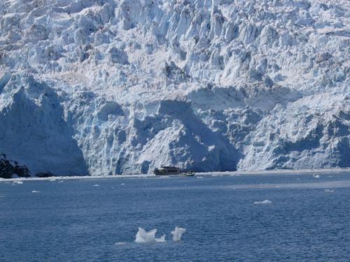 Dicht vor der Eiswand macht der Kapitän die Motoren aus, und in der Stille kann man dem Berg lauschen. Wir sehen (und hören!) auch ein paar kleinere Eisabgänge.