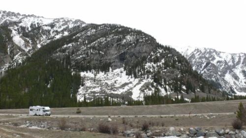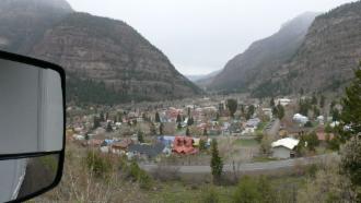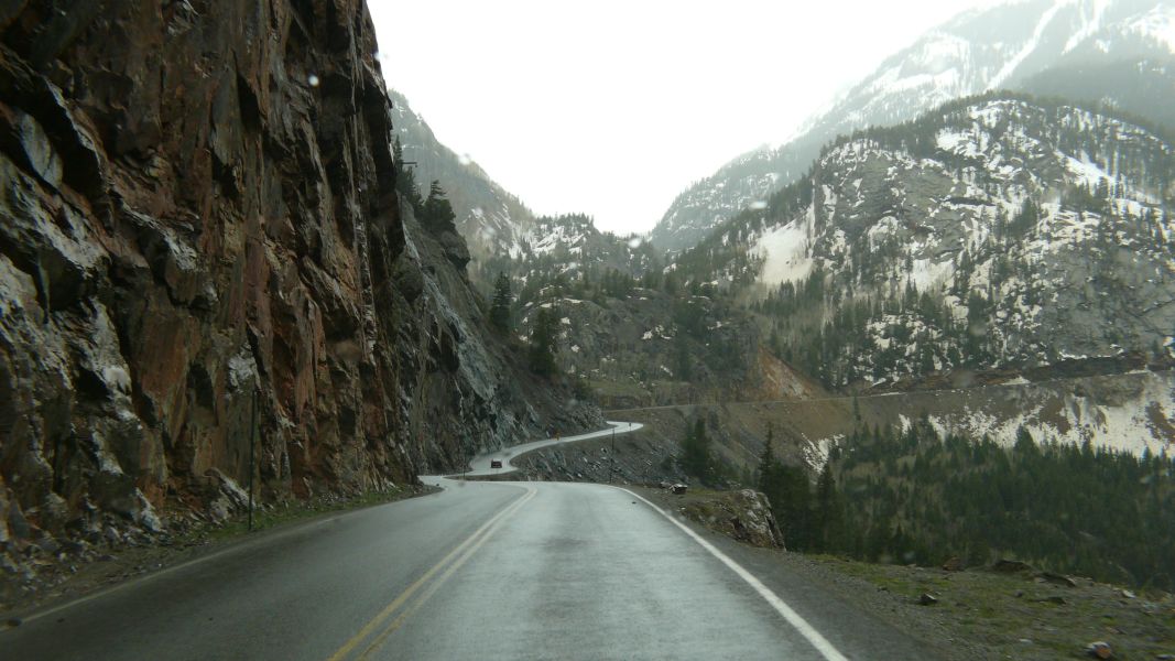 Von hier aus fahren wir zunächst nach Montrose und dann über den Highway 550 weiter nach Süden. Die Straße windet sich an der Schneegrenze entlang durch die San Juan Mountains. Mitten in diesen Bergen liegt auf ca. 2500 m Höhe der Ort Ouray, der auch Little Switzerland genannt wird, weil die Landschaft hier sehr an die Alpen erinnert. Trotz des eher schlechten Wetters – es schneit immer mal wieder – und der vielen Steigungen sehen wir häufiger Radfahrer an der Strecke. Kompliment!