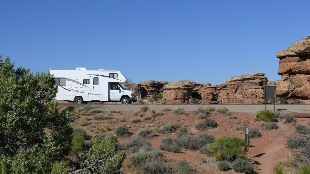Kurz vor dem Parkeingang finden wir einen sehr schön gelegenen Campground (Canyonlands Needles Outpost). Inmitten der roten Felsen und des roten Sandes fühlt man sich hier fast nach Australien versetzt. Als wir nach dem Sonnenuntergang noch draußen sitzen, fliegen winzige Schwalben auf der Jagd nach Insekten ganz dicht an unseren Köpfen vorbei.