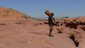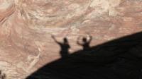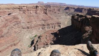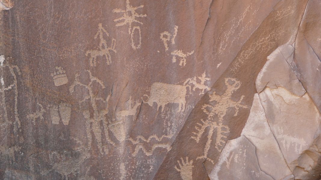 Die Felsen hier im Canyonlands N.P. sind nicht ganz so farbintensiv wie die im Arches N.P., dafür gibt es aber mehr Gesamteindrücke vom Landschaftsaufbau, und wir können in wahrhaft tiefe Schluchten schauen. Mit unseren Schatten bilden wir Petroglyphen nach, das sind in Stein gekratzte Bilder und Symbole aus prähistorischer Zeit, von denen man auch hier in Utah einige findet.