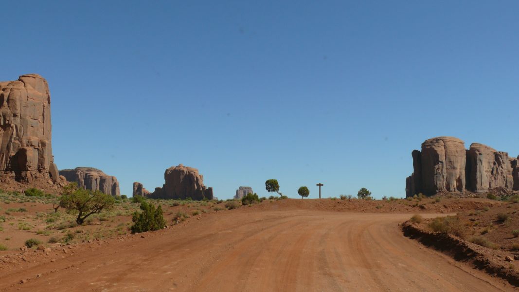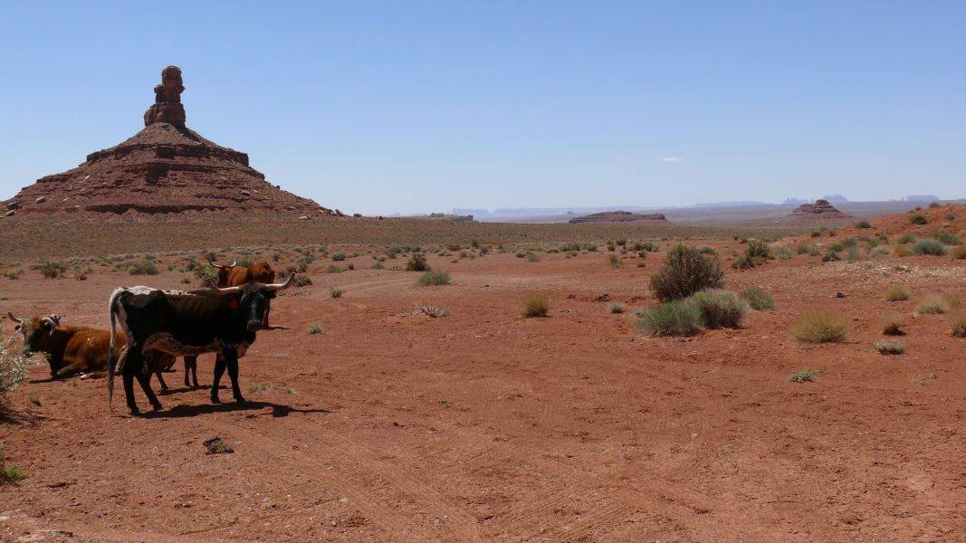 Der Weg führt uns durch Blanding nach Süden und über die Comb Ridge in Richtung Mexican Hat. Die Gegend ist mit rotem Sand gepudert so weit das Auge reicht, manchmal mit kargen Büschen gespickt, und ab und an sieht man auch Vieh auf der Weide. Kurz vor dem Monument Valley überqueren wir den San Juan.