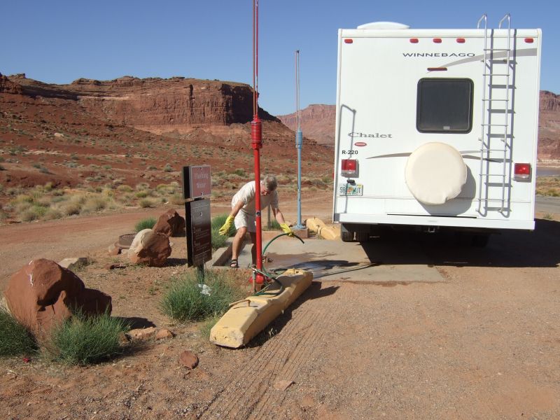 Die Idee, hier am Campground auch noch zu tanken, geben wir allerdings auf. Die Gallone (= 3,8 Liter) Benzin kostet über fünf Dollar, an normalen Tankstellen bekommen wir sie für zwei. Da ist die Monopolstellung doch etwas zu sehr ausgereizt, und unser Tank ist glücklicherweise noch halbwegs gut gefüllt.