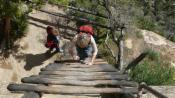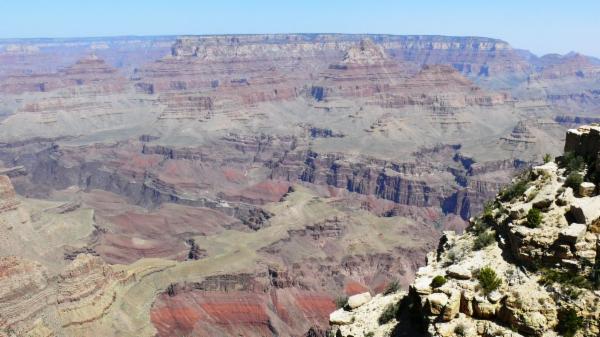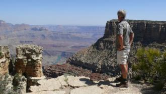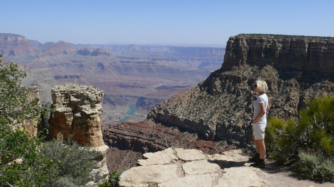 Beides tun wir nicht, wir fahren mit dem Shuttlebus die South Rim entlang, die südliche Kante, laufen auch ein Stück, aber alles in allem bleibt der Besuch eher enttäuschend bis auf die wenigen Augenblicke, in denen wir bewusst hinunter schauen und uns klar machen, dass wir nun 1,3 km tief nach unten blicken und dass der ganze Canyon so lang ist wie die Entfernung von Berlin bis fast ins Ruhrgebiet. In diesen Momenten bekommen wir eine leise Ahnung von den wirklichen Dimensionen dieses Naturwunders. Es bleibt ein Gefühl der verpassten Chance, so nach dem Motto: "Wenn man schon einmal hier ist, …". Aber letzten Endes fühlen wir uns auch inmitten dieser Menschenmassen nicht wohl, und um ihnen zu entfliehen, braucht man wieder mehr Zeit. Vielleicht kommen wir eines Tages hierher zurück und bleiben dann lang genug, um den Grand Canyon angemessen zu würdigen.