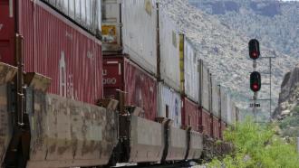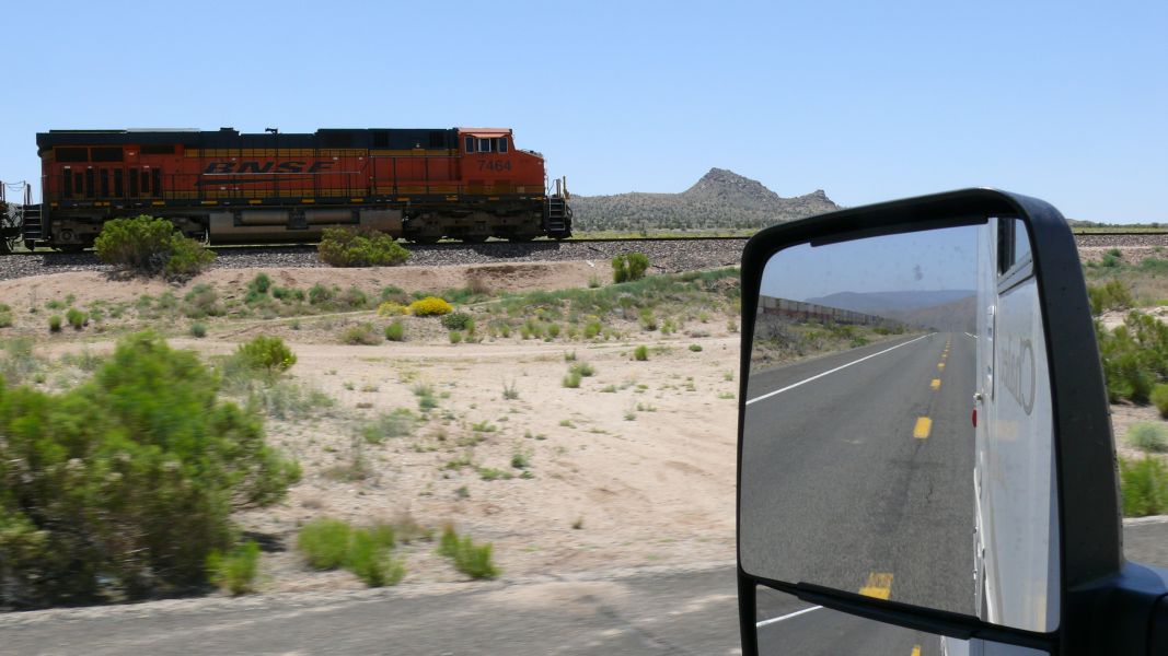 Entlang der Straße verläuft eine Bahnlinie, und unsere Fahrt wird begleitet von einem Güterzug mit sage und schreibe 179 Waggons, davon mehr als die Hälfte doppelstöckig mit Containern beladen. Immer wieder hören wir ihn pfeifen. An Steigungen haben die sechs Lokomotiven (vier vorne und zwei hinten) durchaus zu kämpfen, aber im Gefälle holen sie die uns gegenüber verlorene Zeit immer wieder auf.