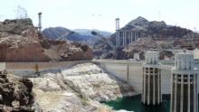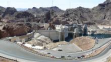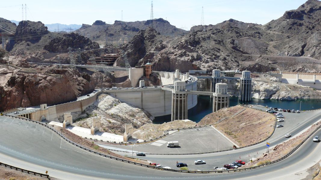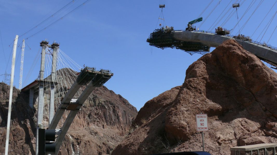 Kurz vor Las Vegas fahren wir über den Hoover Dam, die zweite große Staumauer, die den Colorado aufstaut, hier zum Lake Mead. Vorher müssen wir mit dem Auto durch den Security Check. Ein Beamter kommt herein und schaut in Schränke und Bad. Wir wissen nicht genau, ob er Sprengstoff oder blinde Passagiere sucht. Aber wir dürfen weiterfahren. Die Gegend um den Damm ist eine einzige große Baustelle, es wird eine Brücke gebaut, die die Staumauer vom Autoverkehr entlasten soll.