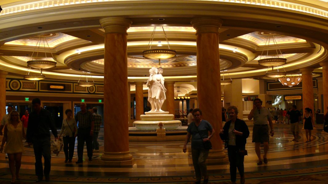 Es ist später Nachmittag, und bei vielleicht 40° Cel in der Sonne stürzen wir uns ins Gewühl. Die erste Hürde ist schon das Circus Circus, das Hotel, an dem der RV Park liegt und durch das wir hindurch gehen wollen, um zur Straße zu kommen. In Reiseführern hatten wir gelesen, die Hotels in Las Vegas würden ihre Ausgänge verstecken, weil die Betreiber ein großes Interesse daran hätten, dass die Gäste im Haus bleiben und die dazugehörigen Casinos und Restaurants besuchen. So richtig geglaubt haben wir das nicht, bis wir selbst hier herumirren und eigentlich nur durch Ulrichs Orientierungssinn in die richtige Richtung und dann auch zum Hauptausgang finden. Obwohl das Circus Circus nicht zu den ganz großen Häusern in Las Vegas gehört, passieren wir hunderte von Spielautomaten in verschiedenen Sälen, es gibt eine weitläufige Ladenpassage und mehrere Restaurants.