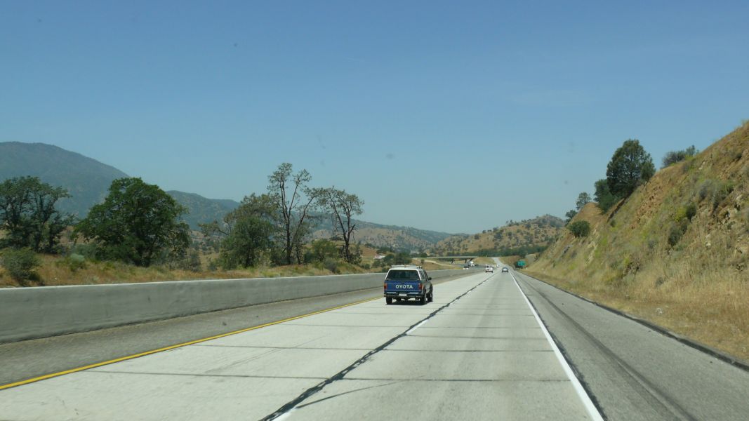 Langsam verändert sich die Landschaft. Mittlerweile ist schon eine Grasnarbe auf den Hügeln zu sehen und nicht mehr nur Kakteen und Joshuatrees, und Bakersfield am Ende des Highway #58 besticht gar durch Palmen und üppig blühenden Oleander.