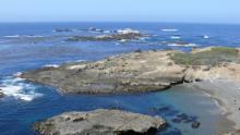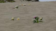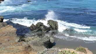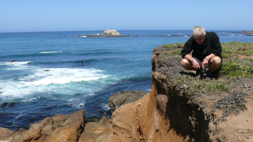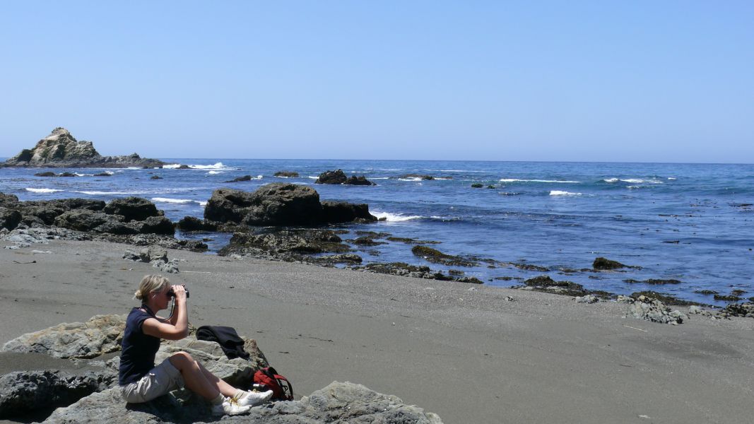Ein Stück weiter nördlich nehmen wir uns Zeit für einen Spaziergang am Rand der Klippe entlang und dann hinunter zum Strand. Die Blicke übers Meer sind fantastisch, aber auch zu unseren Füßen finden wir viel Interessantes. Der Boden ist dicht bewachsen mit einer Vielzahl von kleinen Blumen – Frühling am Pazifik!