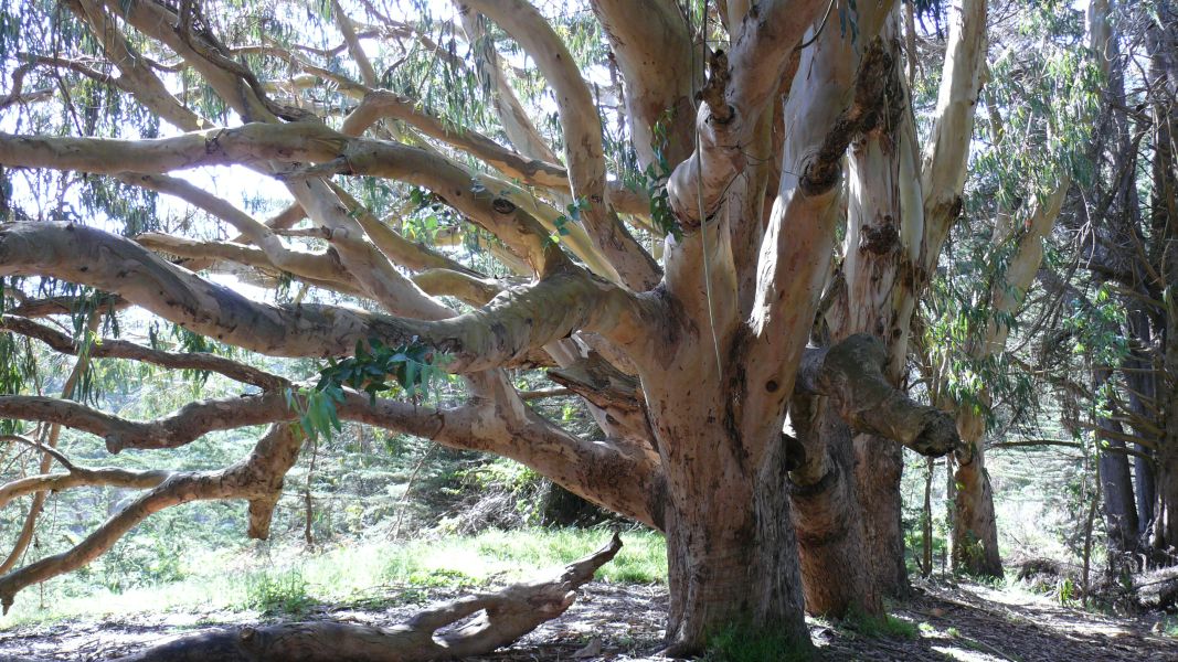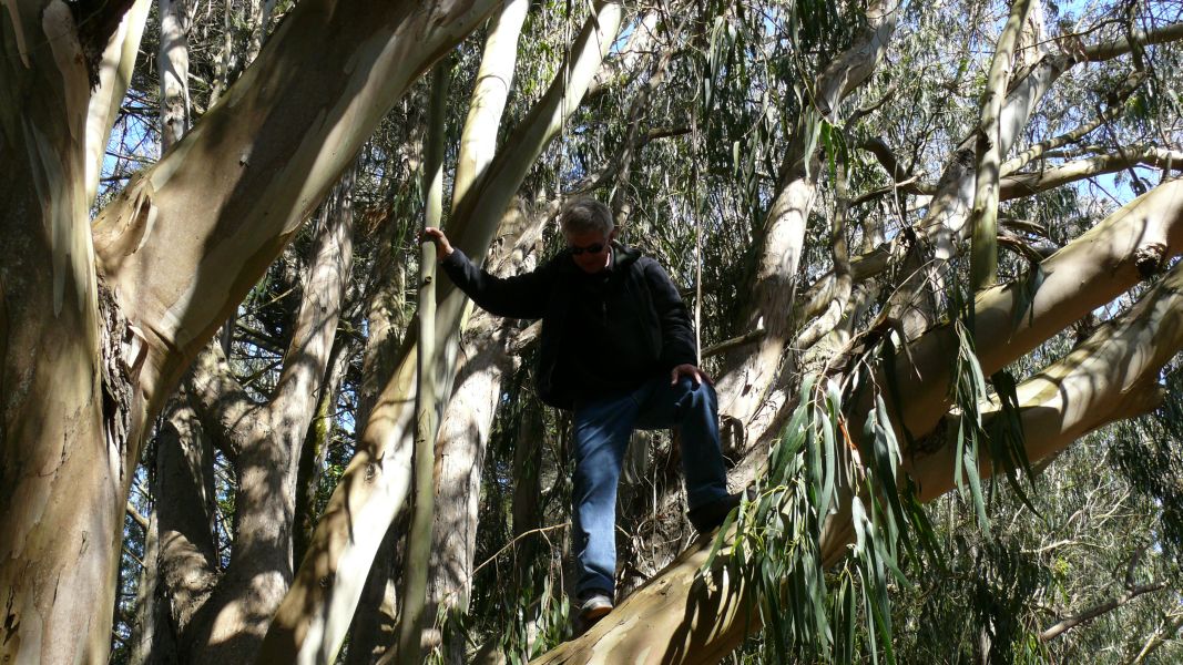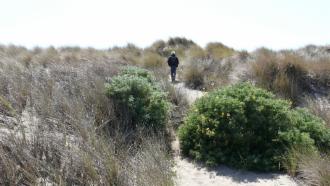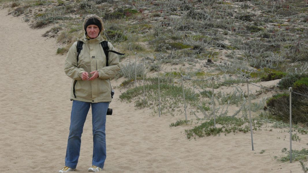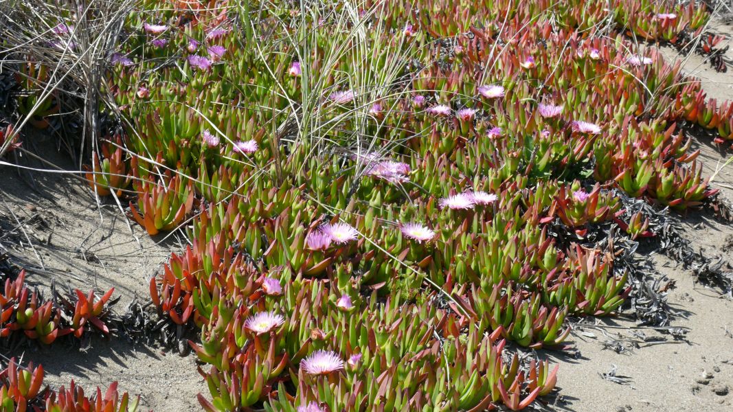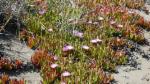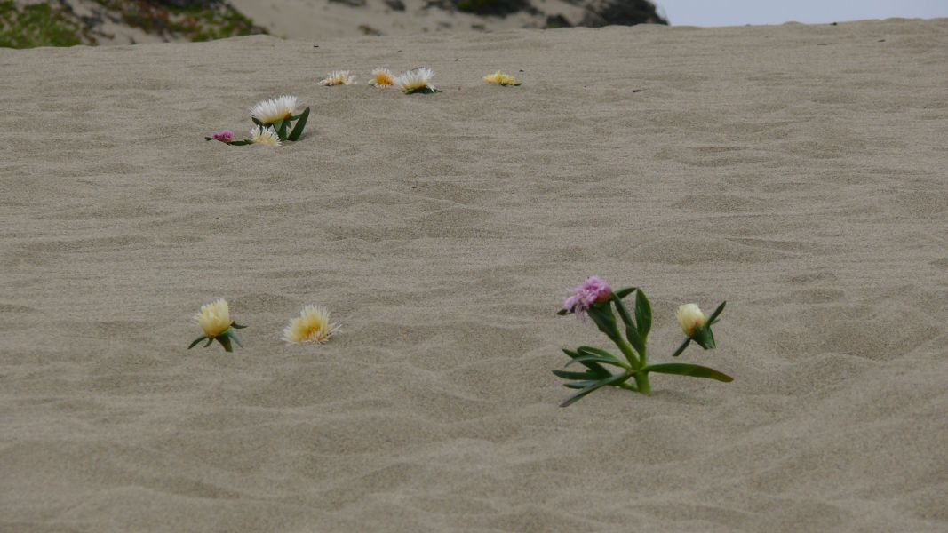 Mittlerweile scheint die Sonne, und der Himmel ist blau, aber der stürmische Wind ist eisig kalt. Von unserem Stellplatz aus sind wir in 20 Minuten am Strand. Auf dem Weg dorthin wachsen riesige Eukalyptusbäume, und der Strand selbst ist geschützt durch hohe Dünen, die fast vollständig mit einer kleinwüchsigen pinkfarbenen Margeritenart bewachsen sind.