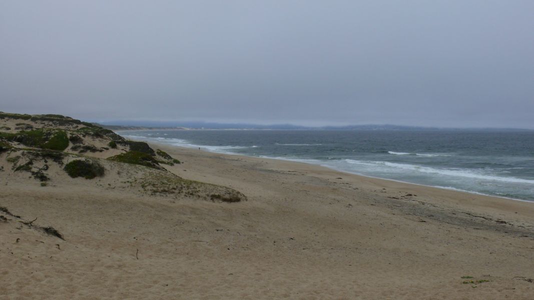 Die Sonnenbrillen können wir heute getrost in der Tasche lassen. Die Monterey Bay ist von tiefhängenden Wolken überzogen, und besonders warm ist es auch nicht. Trotzdem wagen wir uns nach dem Frühstück über die Düne, um einen Blick aufs Meer zu werfen. Wir sind warm angezogen, aber es bleibt ungemütlich. Der Wind pfeift uns gehörig um die Ohren. Besonders lang halten wir es hier nicht aus.