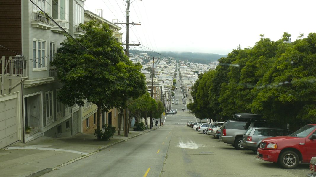 Allein die Lombard Street ist nun wirklich zu steil. Das versuchen wir erst gar nicht, da auch das Hinabfahren durch den kurvigen Teil mit unserem Auto gar nicht möglich wäre. Aber wir waren ja schon einmal mit einem PKW hier, nur hatte ich vergessen, wie steil es wirklich ist. Die Autos parken mit zum Bordstein gedrehten Rädern, und wenn man im rechten Winkel zum Bürgersteig parkt, fällt einem die Autotür aus der Hand oder man bekommt sie kaum auf, je nachdem, ob man nach unten oder nach oben aussteigt. Wir klappern noch ein paar Orte ab, an die wir uns erinnern, und dann geht es über die Golden Bridge weiter nach Norden. Bei der Auffahrt auf die Brücke bleiben wir an der Tollstation fast stecken: Wir haben übersehen, dass es unterschiedliche Durchfahrten für PKW und größere Fahrzeuge gibt. Das hätte peinlich werden können, aber wir passen noch so grade hindurch.