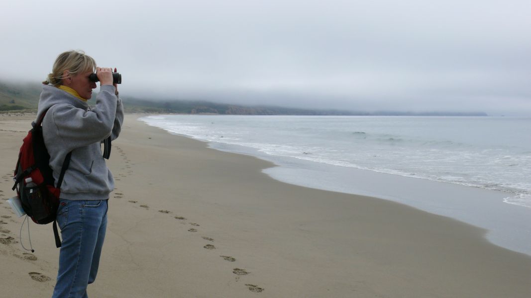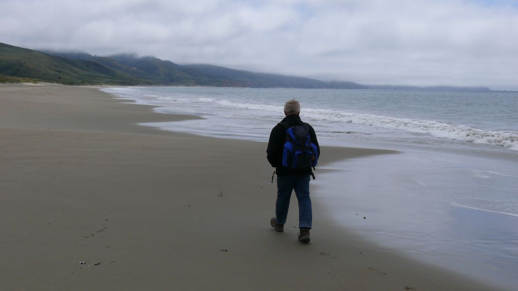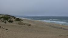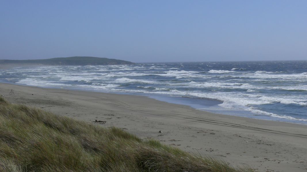 Zunächst aber fahren wir, wie geplant, in den Point Reyes National Seashore Park. Es ist sehr dunstig, und im Visitor Center erfahren wir, dass der Nebel direkt am Meer eher noch dichter ist. Man sagt, Point Reyes sei der windigste Ort am Pazifischen Ozean und der zweit-nebligste Ort auf dem amerikanischen Kontinent, und das scheint sich heute zu bestätigen. Wir verzichten darum auf eine Fahrt zum Leuchtturm, der am westlichen Zipfel von Point Reyes steht. Das ist bedauerlich, aber das Bild der Webcam von dort zeigt nur graues Einerlei. Dann lohnt sich die doch ziemlich lange Fahrt nicht. Stattdessen machen wir uns lieber auf zur Limantour Beach und laufen dort ein wenig. Auf dem Weg dorthin durchqueren wir mehrere Nebelbänke, aber am Wasser ist es wieder halbwegs klar, auch wenn die Sonne es nicht ganz durch die Wolken schafft.