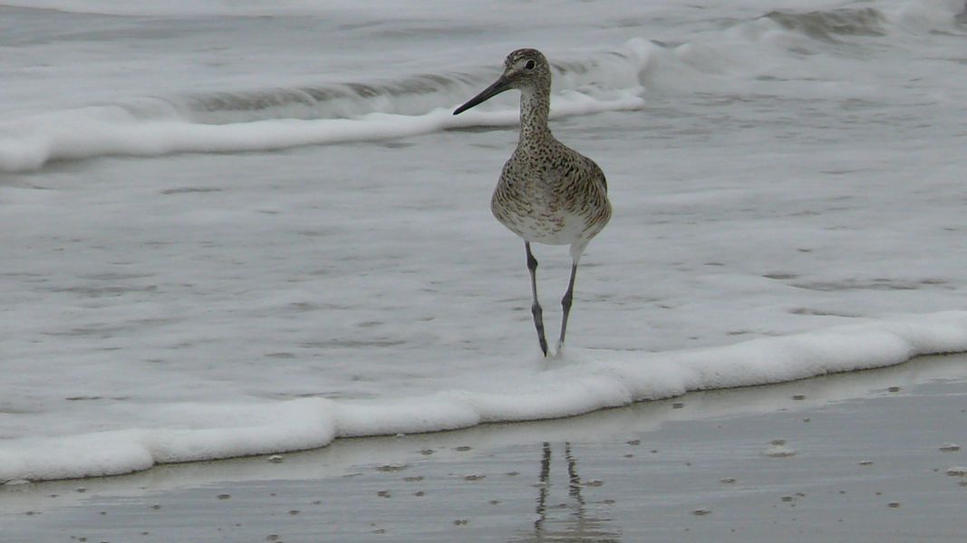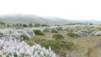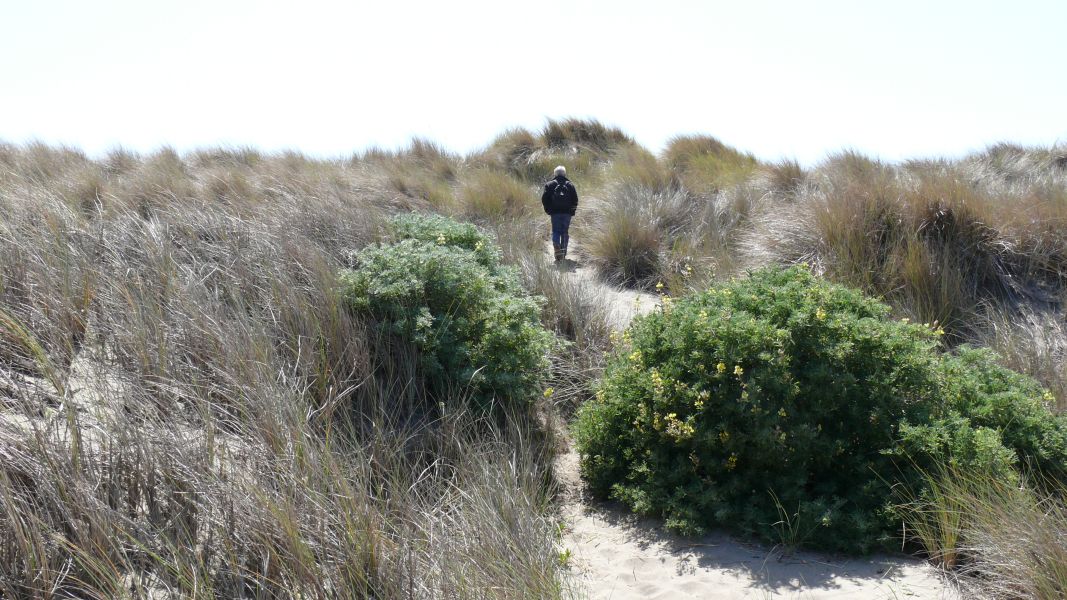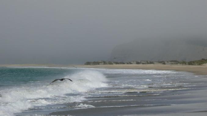 Durch einen Marschlandgürtel mit riesigen Büschen blühender Lupinen gelangen wir zum Meer. Das eher schlechte Wetter hat den Vorteil, dass wir den Strand nur mit ein paar Seevögeln teilen müssen. Eine junge Möwe macht es sich im Sand bequem, ein einsamer Stelzvogel steht im Wasser und wartet darauf, dass ihm Futter vor die Füße gespült wird, und größere Formationen von Pelikanen fliegen über die Brandung. Wir genießen den Spaziergang sehr.