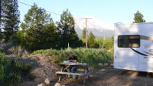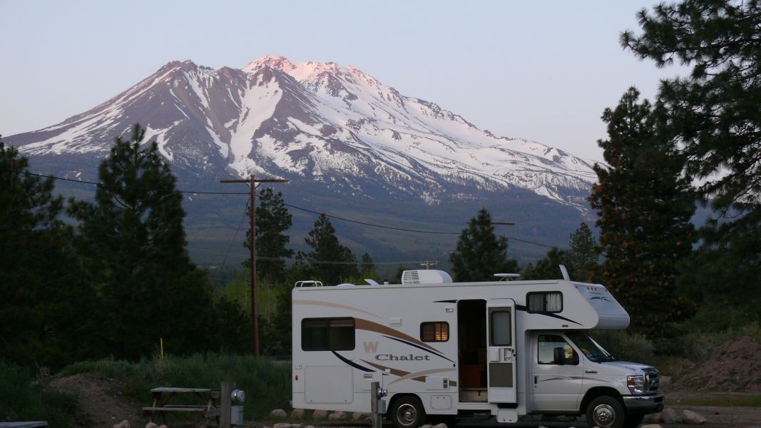 Mount Shasta ist mit einer Höhe von 4300 Metern der höchste Berg Kaliforniens und der zweithöchste Vulkan der USA. Wir finden einen Übernachtungsplatz mit Blick auf seinen schneebedeckten Gipfel (Friendly RV Park, Weed).