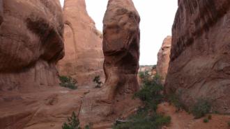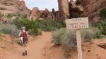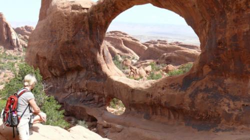 Wir stehen heute wieder zeitig auf und sind um kurz vor neun am Trailhead im Devil's Garden Bereich des Nationalparks. Wir wollen zum Double O Arch, ein laut Reiseführer nicht ganz einfacher Weg, der teilweise erklettert werden muss und über glatten Felsen führt. Es ist richtig: der Weg ist kein Spaziergang, aber mit guten Wanderschuhen und etwas Trittfestigkeit ist er halbwegs problemlos zu schaffen. Außerdem entschädigt die grandiose Kulisse für alle Anstrengungen. Klettern ist nun wahrlich nicht meine Passion, aber für die einzigartigen Eindrücke auf dieser Wanderung würde ich auch noch weitaus schwierigere Passagen in Kauf nehmen. Zudem entwickle ich auch langsam eine gewisse Freude daran, immer noch ein Stück höher empor zu steigen.