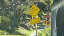 In Stewart’s Point finden wir zunächst die Straße nicht, in die wir abbiegen wollen, um zum Highway #101 zu gelangen, der ersten Etappe auf dem Weg zur Interstate 5. Das liegt weniger daran, dass es zu viel Auswahl gäbe, sondern eher daran, dass die Straße so klein und unscheinbar ist, dass man sie leicht übersieht. Erst beim Vorbeifahren nehmen wir sie überhaupt wahr. Ein Schild kündigt an: "Winding narrow Road next 4 Miles, RV’s and Trailers not recommended." Natürlich machen wir uns trotzdem auf den Weg, die Alternative wäre ein Umweg von achtzig bis hundert Meilen.