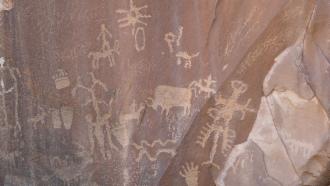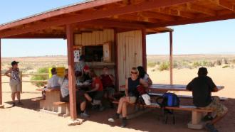 Insgesamt sind wir wieder einige Stunden unterwegs, bevor wir uns auf die Weiterfahrt nach Süden zum Monument Valley machen. Gleich hinter der Nationalparkgrenze gibt es den sogenannten Newspaper Rock, einen Felsen mit besonders vielen, diesmal den echten, Petroglyphen.