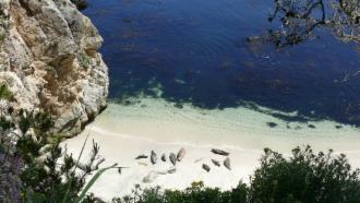 Der Start ist nicht so gut. Man lässt uns mit dem RV nicht in den Park hinein, wir müssen an der Straße parken und dann laufen. Nun ja, so fürchterlich weit ist es auch nicht. Gleich am Anfang können wie Taucher beobachten (Point Lobos ist ein bekanntes Tauchgebiet), und ein Stückchen weiter sonnen sich ein paar Robben am Strand. Die Jungen spielen im Wasser und rufen ständig nach ihren Müttern.