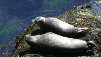 Der Weg führt meist am Meer entlang, und an der Spitze der Landzunge kann man ein wenig in den Felsen herum klettern. Auch hier gibt es wieder Robben, die wie zu fest gepresste Würste auf den Steinen liegen.