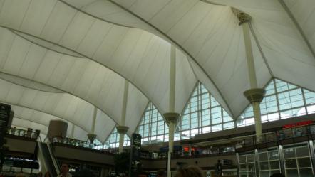 Je mehr wir uns Cincinnati nähern, umso größer wird unsere Sorge, dass wir es in der kurzen Aufenthaltszeit (nur etwas über eine Stunde) nicht schaffen, den Anschlussflug nach Denver zu erreichen. Wir müssen durch die Immigration (Fingerabdrücke, Foto, Fragen), und wir müssen unser Gepäck nehmen und neu aufgeben. Das ist immer nötig auf dem ersten Flughafen, den man in den USA erreicht. Möglicherweise müssen wir auch erneut durch die Sicherheitskontrolle. Die Erfahrungen aus Paris stimmen uns da nicht gerade optimistisch. Außerdem sitzen wir ganz hinten in der Maschine und werden darum als letzte aussteigen. Ein vager Versuch, vor der Landung in die erste Klasse (nach vorne) umzuziehen, schlägt fehl - die Stewardess meint, es werde kein Problem geben. Umso erfreuter sind wir, als wir eine viertel Stunde früher als geplant landen; leider geht die eingeholte Zeit aber wieder verloren, weil es Schwierigkeiten beim Andocken an den "Rüssel" gibt.