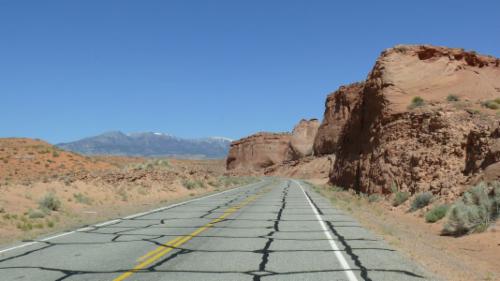 Die Gegend wirkt besonders unwirtlich, fast außerirdisch. Für ambitionierte Wanderer gibt es hier besonders interessante Felsstrukturen zu bestaunen, die Coyote Buttes im Paria Canyon. Die bekannteste Form heißt The Wave, weil die Auswaschungen ein wellenförmiges Muster hervorgebracht haben. Das sieht alles sehr faszinierend aus, aber der Trailhead ist weit von der Straße entfernt, und für den wirklich interessanten Teil gibt es nur eine limitierte Anzahl Permits, die man Monate vorher im Internet erwerben muss. Solch ein Permit haben wir natürlich nicht, und so erleben wir diese Gegend nur en passant aus dem Auto heraus. Bei mittlerweile schon deutlich über 30° Cel. ist das vielleicht auch nicht die schlechtere Alternative.