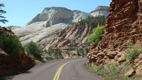 Am Nachmittag fahren wir weiter Richtung Zion National Park. Die Fahrt ist eher langweilig, oder sagen wir: geruhsam. Denn es ist durchaus entspannend, auch mal durch grünes Farmland zu fahren und keine Highlights anschauen zu müssen. Das ändert sich aber schon schnell wieder, als wir in den Zion N.P. hineinfahren. Fotoapparat und Filmkamera werden abwechselnd angeworfen, um die Eindrücke einzufangen. Hier sehen die Felsen wieder ganz anders aus als in den anderen Nationalparks, die wir schon gesehen haben.