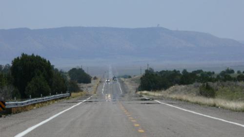 Wir müssen unsere Fantasie ganz schön anstrengen, um diese alten Träume aufleben zu lassen, aber nachdem wir Seligman mit dem Touristenschrott hinter uns gelassen haben, rollen wir gemütlich durch die Weite Arizonas. Es geht Meile um Meile immer geradeaus, entgegenkommende Fahrzeuge spiegeln sich in der flirrenden Sonne, einzelne Windhosen zeigen sich, und wenn auf den kargen Feldern gearbeitet wird, ist die Staubwolke weithin sichtbar. Wer immer hier einen Führerschein macht, muss das Kurvenfahren woanders üben.