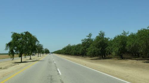Westlich von Bakersfield tauchen große Plantagen mit Orangen- und Mandelbäumen auf. Das eigentliche Land ist trocken und unfruchtbar, aber mit einem enormen Aufwand an Dünger und künstlicher Bewässerung wird die Ernte abgetrotzt. Wir fahren über den Lerdo Highway ca. 30 Meilen schnurgeradeaus gen Westen. Die Straße ist von Zitrusbäumen gesäumt. Es fehlt nur noch das Ford T-Modell, und die Kulisse für Steinbecks "Früchte des Zorns" wäre perfekt.