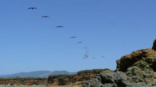 Hier sehen wir zum ersten Mal einen Schwarm Pelikane, der in Zugvogelformation die Küste entlang fliegt. Wir werden so etwas in den nächsten Tagen noch häufiger sehen. Die Vögel machen nicht den Eindruck, als hätten sie ein bestimmtes Ziel. Manchmal löst die Formation sich auf, manchmal finden sich die Pelikane wieder zusammen, manchmal verteilen sie sich in alle Himmelsrichtungen.