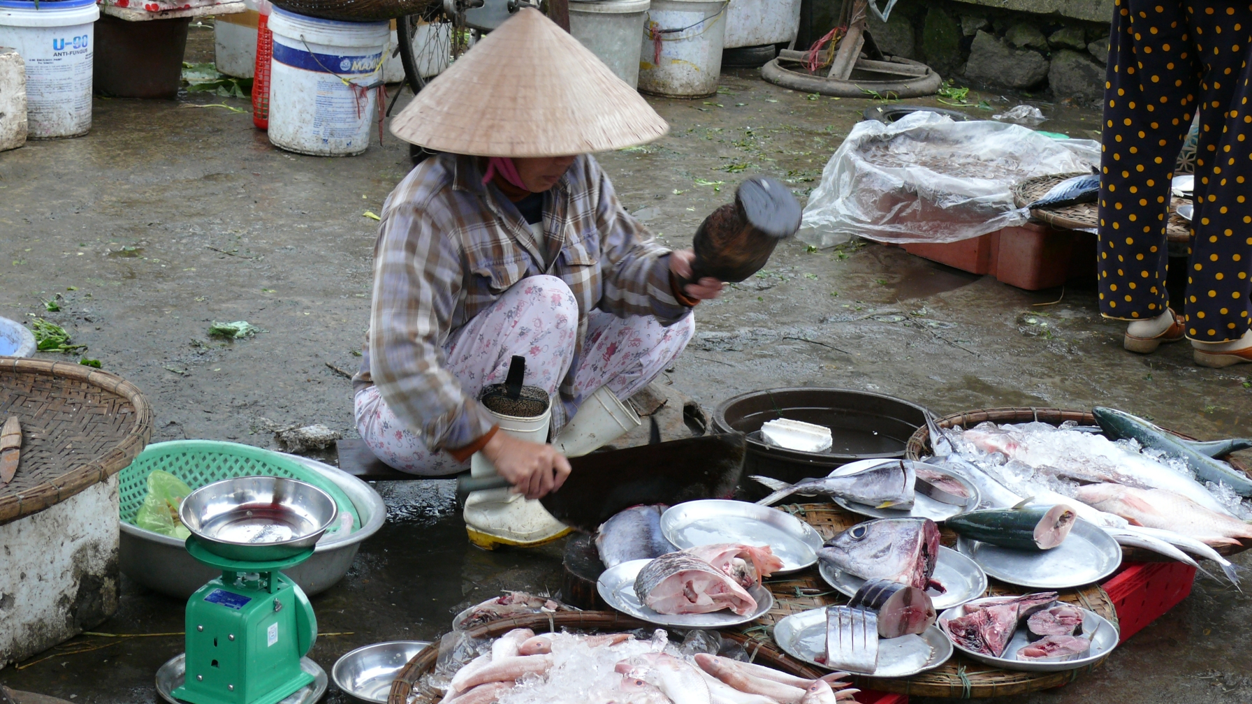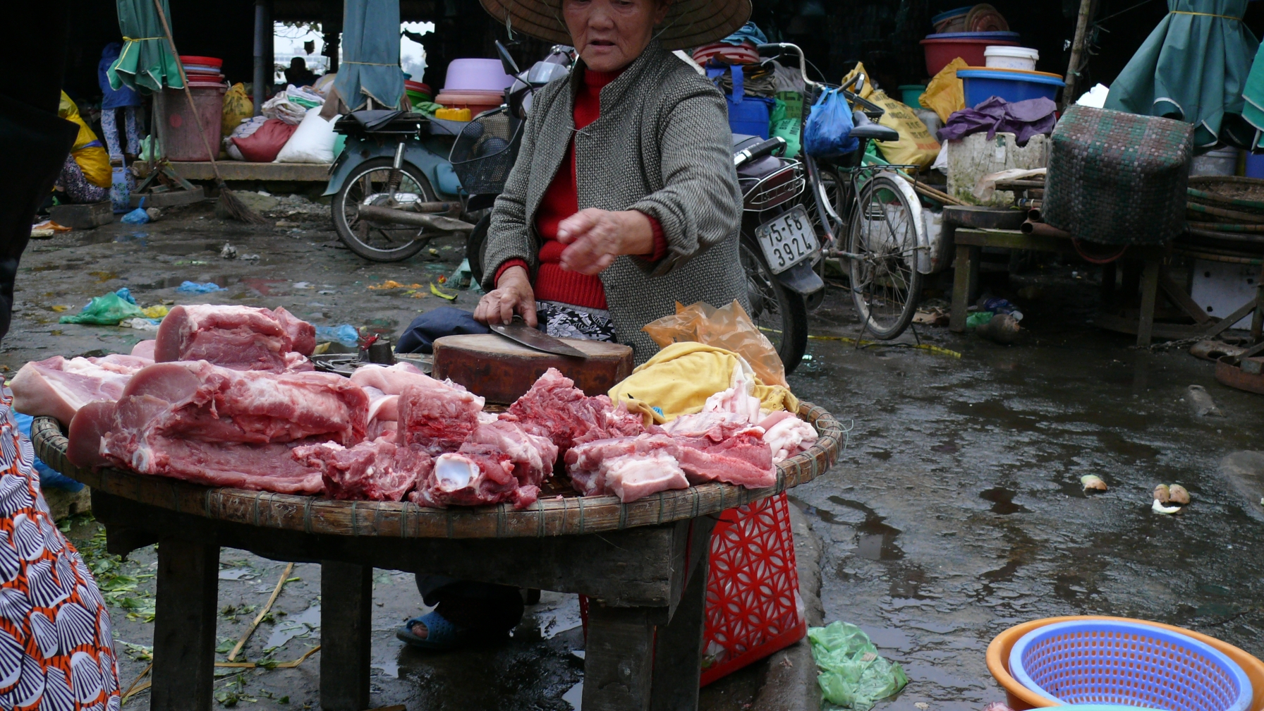 Nachmittags fahren wir mit der Gruppe zum Dong Ba Markt. Hier herrscht wildes Getümmel, und in den engen Gängen darf man keine Berührungsängste haben.