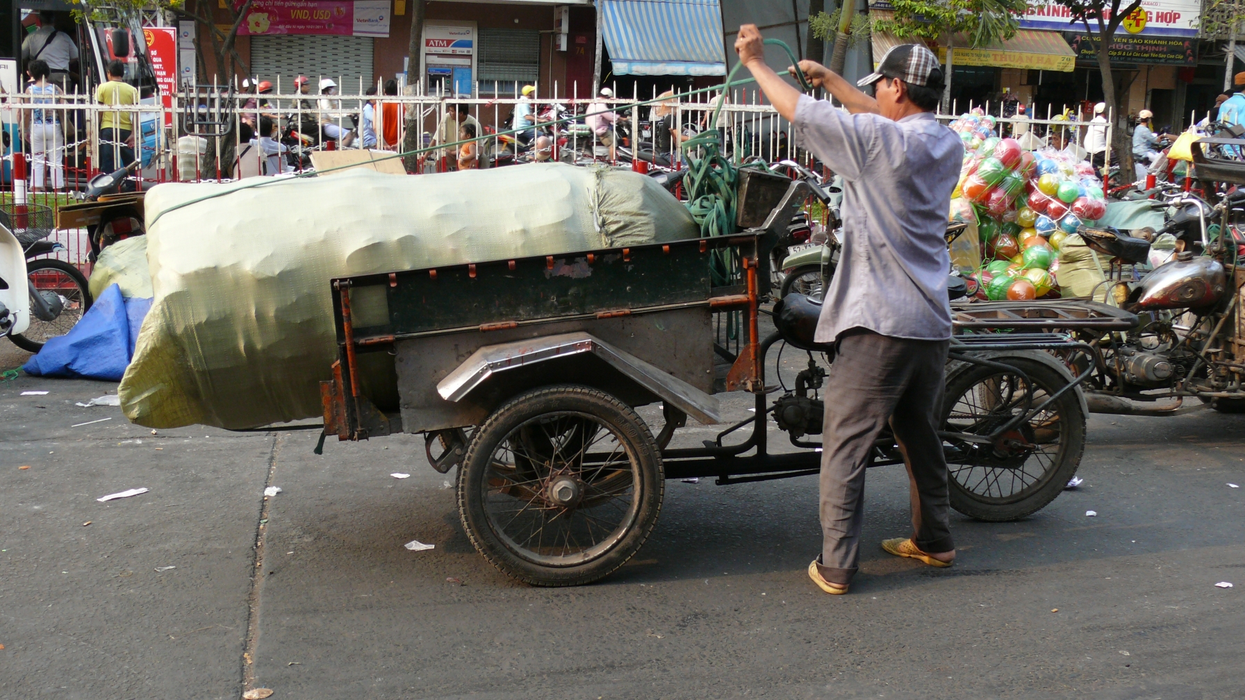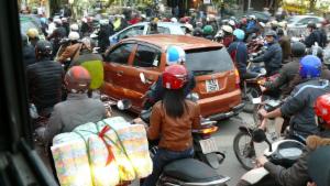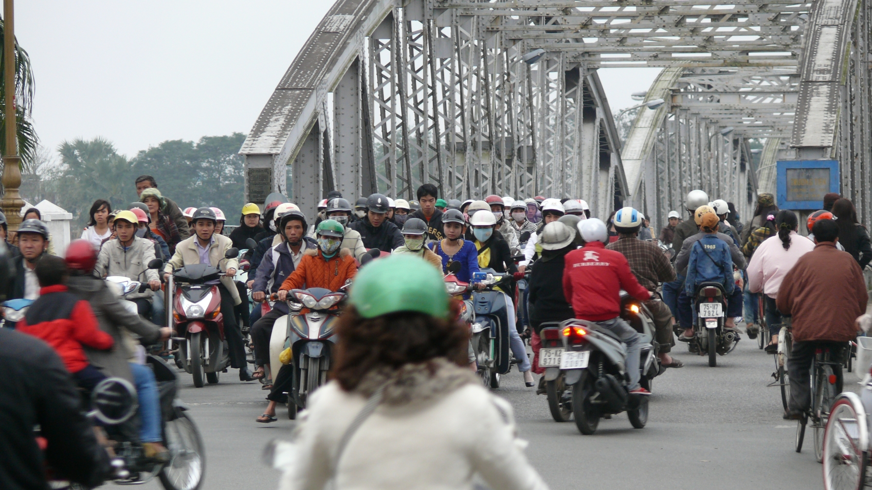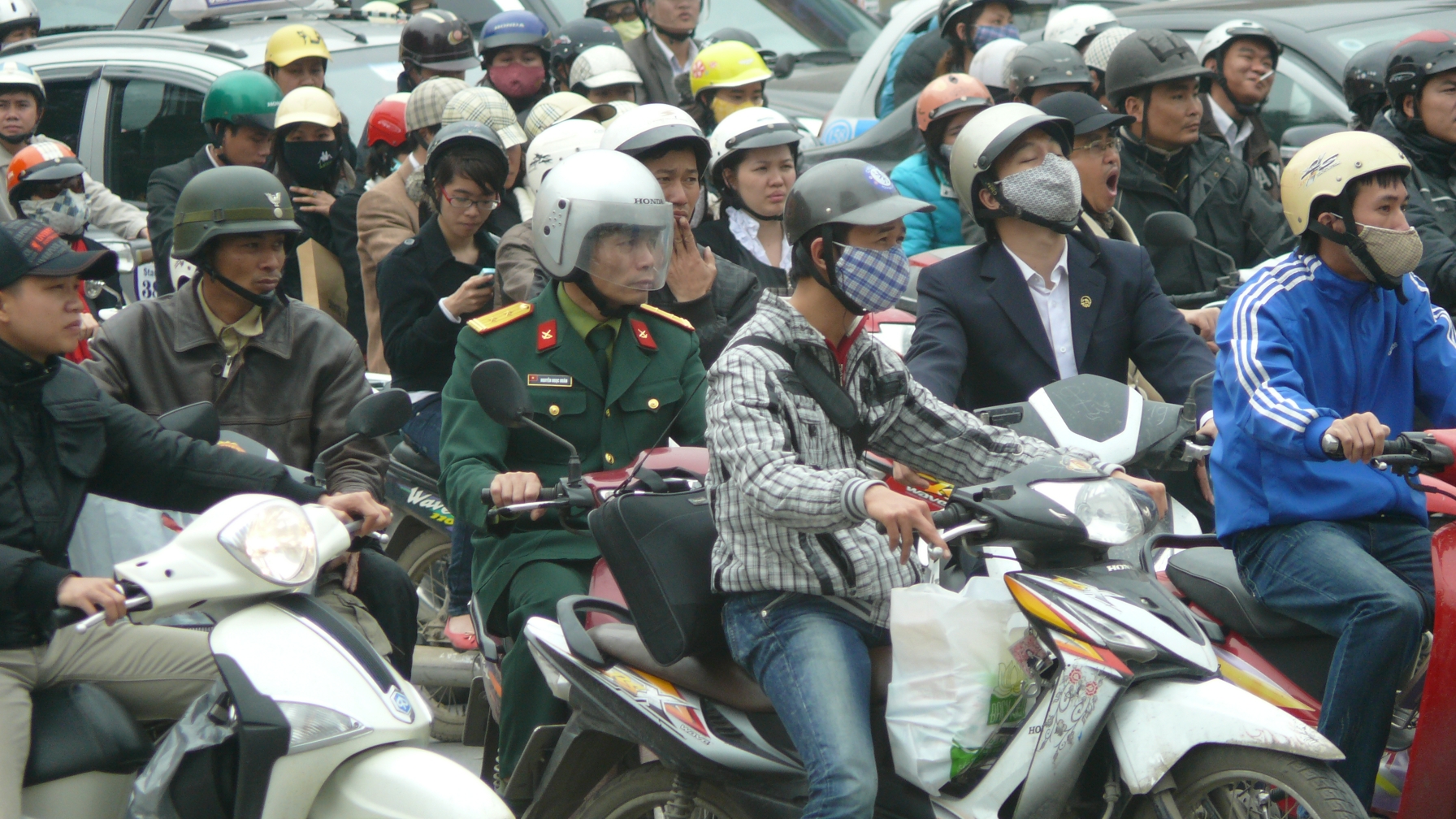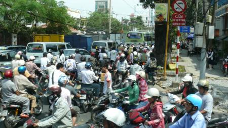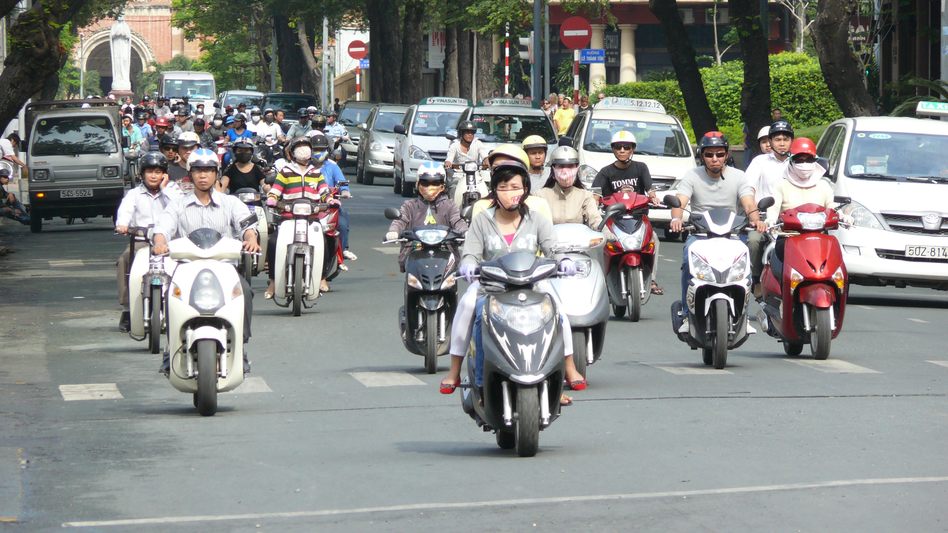 In 2010 waren in HCMC ca. 4,1 Millionen Motorräder registriert (aber nur 400.000 Autos) bei einer Einwohnerzahl von knapp über 7 Millionen Menschen. Auf den ersten Blick gibt es auf den Straßen kein Durchkommen. Fast alle fahren mit Helm und Mundschutz, was dem Straßenbild ein durchaus futuristisches, um nicht zu sagen bedrohliches Aussehen gibt. Die Helmpflicht gibt es in Vietnam noch nicht so lange, und so richtig ernst genommen wird sie auch nicht. Helme werden für ein paar Dong an der Straße verkauft, und man sagt, sie schützen zwar nicht vor Verletzungen, aber vor der Polizei. So trägt auch fast jeder Erwachsene einen Helm, aber für mitfahrende Kinder gilt diese Vorschrift wohl nicht.